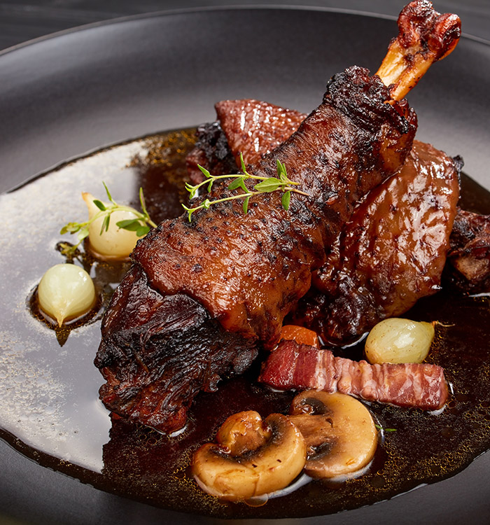 Т.нар. Coq au vin (петел с вино) е традиционно френско ястие. Освен различни истории, свързани с произхода на ястието, съществуват и разнообразни рецепти за приготвянето му, в зависимост от сорта на използваното вино, както и от това, дали месото се маринова или не. В някои случаи месото се оставя да престои едно денонощие, а в други се приготвя по съкратена процедура – без мариноване.
